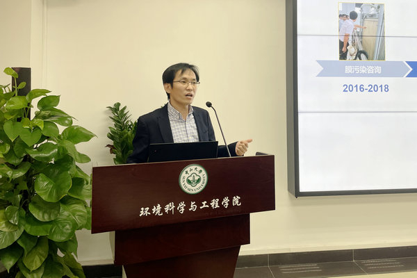 会上,孟凡刚教授分享《一项校企合作项目的研究进展及体会》。以污水处理厂中膜生物反应器的应用现状及难题作为切入点,与珠海水控集团排水公司进行深度合作,从膜污染咨询到横向科研项目到中试,目前正在推进开展示范应用工程。孟老师表示,校企深度合作是实现基础研究和工程应用融合的重要途径,同时也需要兼顾企业需求和自身科研兴趣。