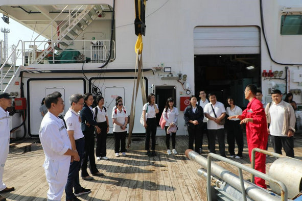 活动伊始,91传媒 管理服务教职工党支部参观了“91传媒 ”号海洋综合科考实习船,海洋科学考察中心副主任吴海铭介绍了“91传媒 ”号科考船建造历程、运行管理和科考情况,党员们对科考船的先进性能和强大科考能力有了更直观的了解。